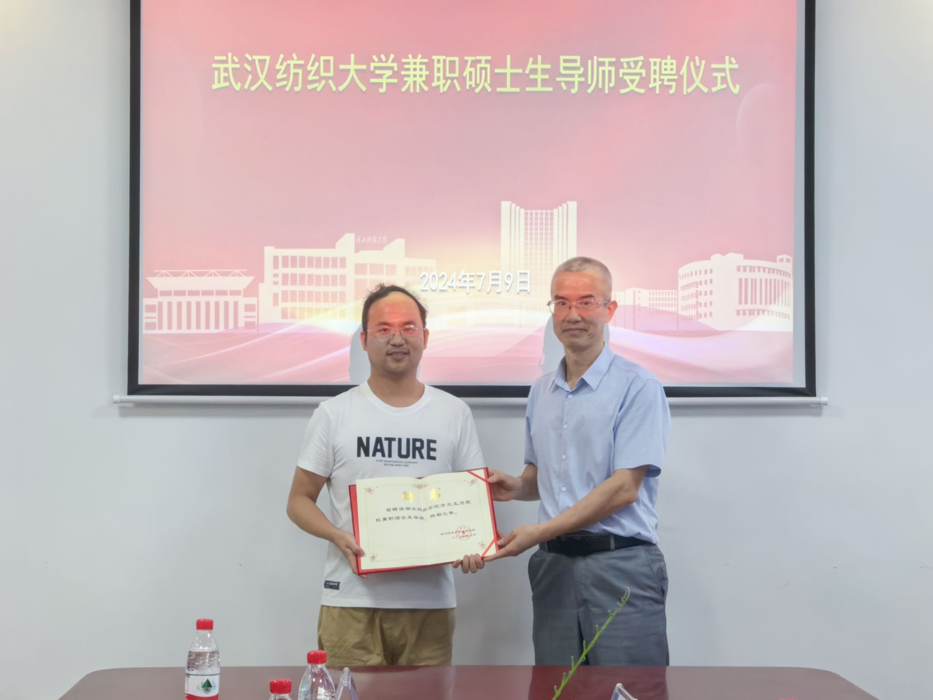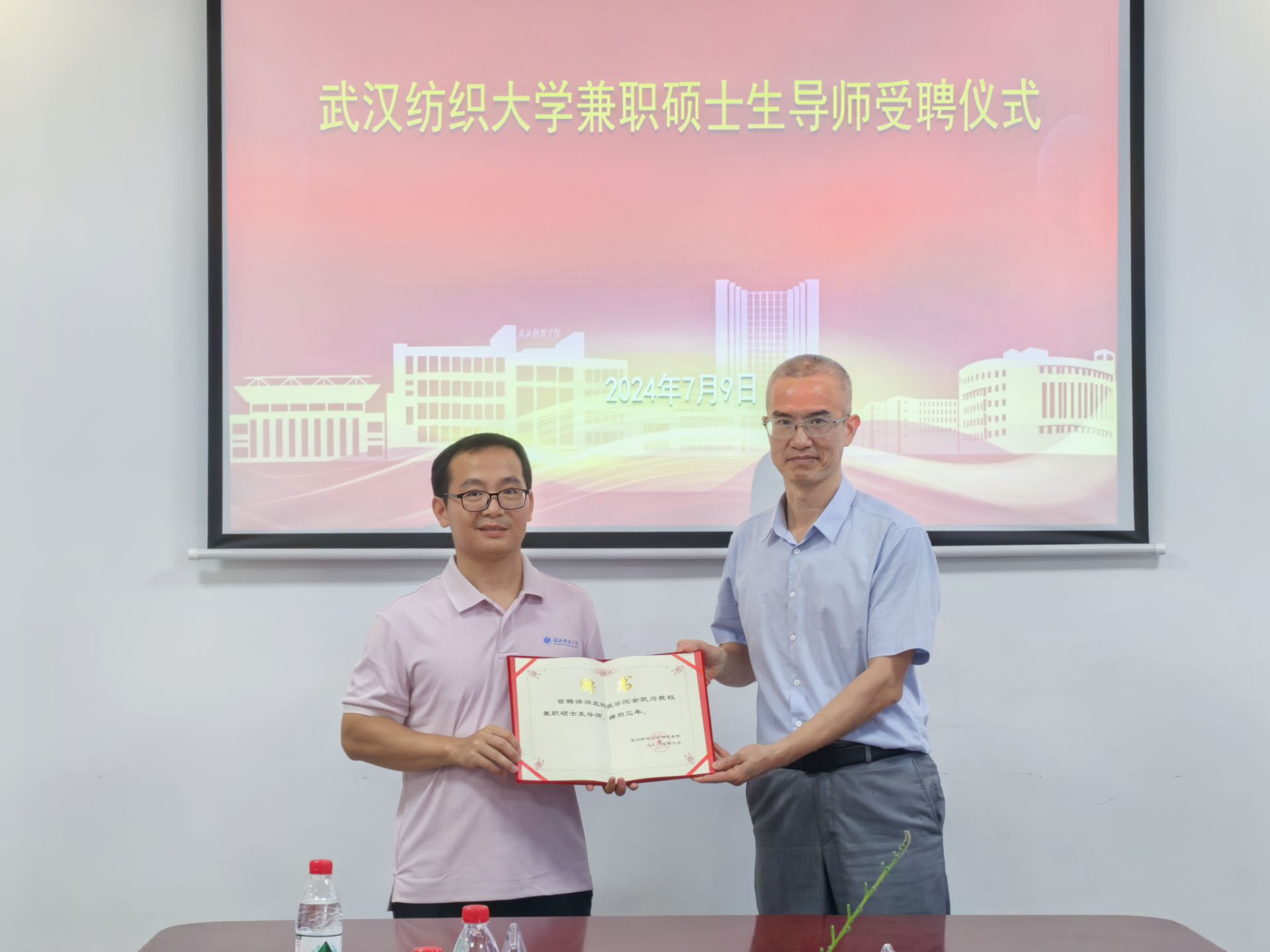 同时,活动还进行了兼职硕士生导师受聘仪式。武汉纺织大学数理科学学院党委书记段溢波教授为我院陈生安教授、吴昭君教授、金凯博士、饶继光博士、方文玉博士颁发武汉纺织大学兼职硕士生导师聘书。这一举措不仅壮大了武汉纺织大学硕士研究生导师队伍,也为两校在科研合作、项目攻关、研究生培养等方面搭建了更加坚实的平台。受聘导师们纷纷表示,将积极履行职责,发挥自身优势,为武汉纺织大学的研究生教育事业贡献智慧和力量。