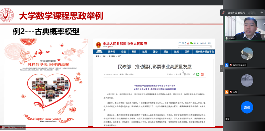 《高等学校课程思政建设指导纲要》指出,全面推进课程思政建设是落实立德树人根本任务的战略举措,是全面提高人才培养质量的重要任务,要求各高校结合专业特点分类推进课程思政建设,并将课程思政融入课堂教学建设全过程。玄祖兴教授的报告从课程思政建设背景开始,介绍了北京联合大学课程思政建设的经验并通过实例演示了其在大学数学课程思政建设方面的具体做法,整个报告既有理论高度、同时对我院课程思政建设的教科研工作有很好的实践参考价值。讲解深入浅出、通俗易懂。