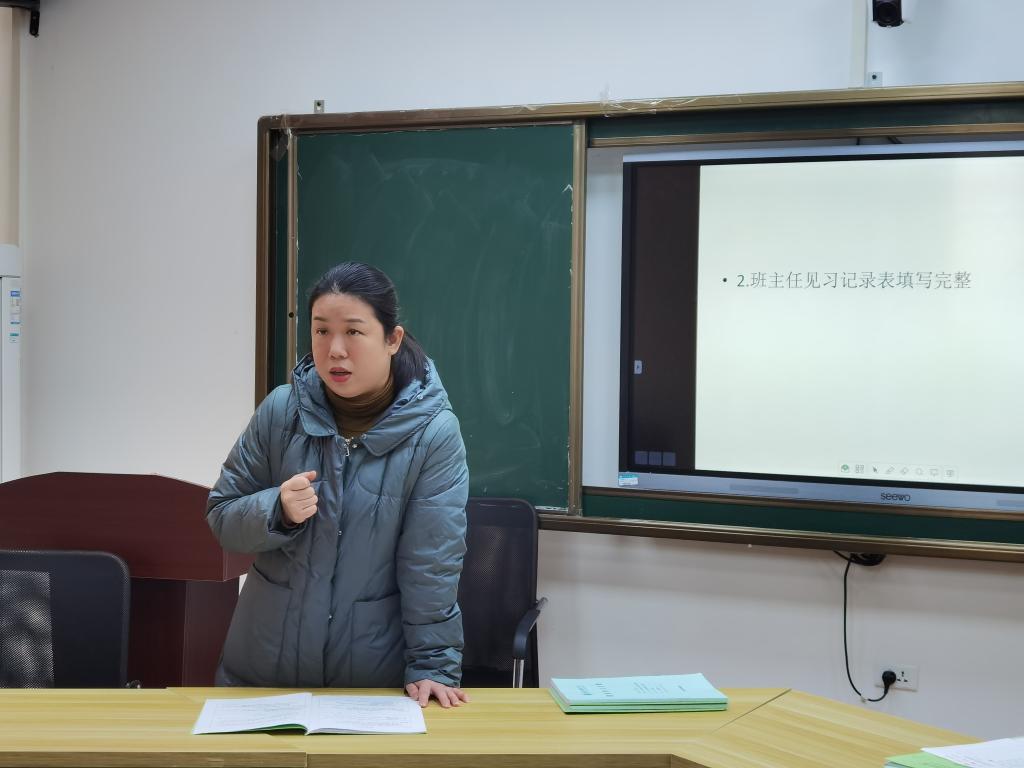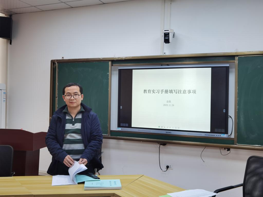首先开展的是校内指导教师业务学习活动。华锐、周芳和金凯分别对《中学教育专业“双导师制”工作记录手册》、《教育见习手册》和《教育实习手册》的内容进行分析和解读,特别强调填写内容的规范性和完整性。