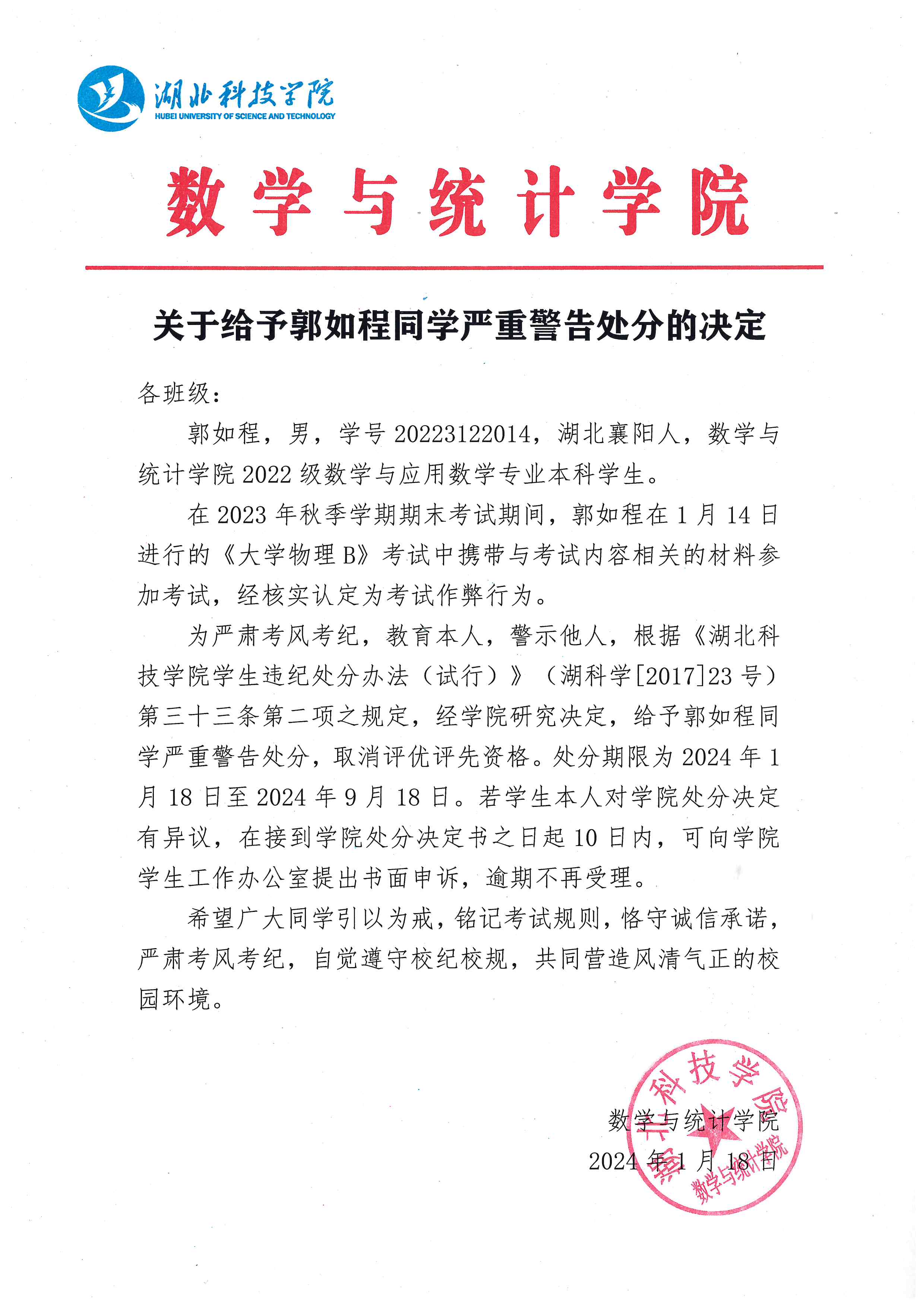 关于给予郭如程同学严重警告处分的决定