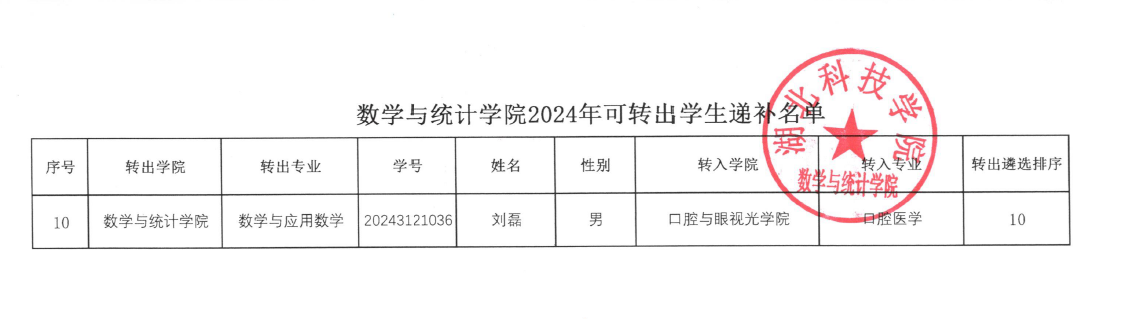 鉴于太阳集团网站8722数学与应用数学专业申请转出人数较多,该专业2024年招生计划95人,按照10%的比例,可转出人数为9.5人,经教务处同意将原转出计划9人调整为10人,按转出细则排名,将排名第十位的同学进行递补,现予以公示。