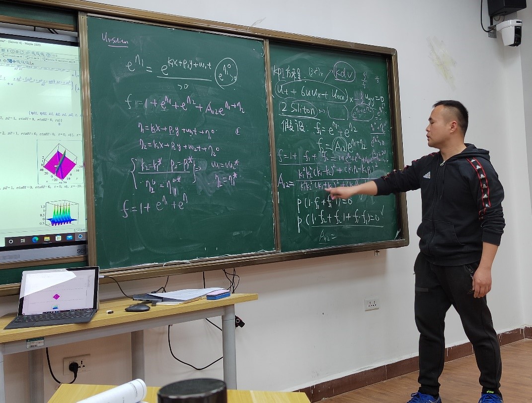 饶博士首先介绍了孤立子的发展历史,然后以KP方程为例,详细介绍了如何利用广田直接法来求解KP方程的1孤立子和2孤立子解的过程,同时在电脑上给大家展示了孤立子解的形状,大家纷纷表示受益匪浅。