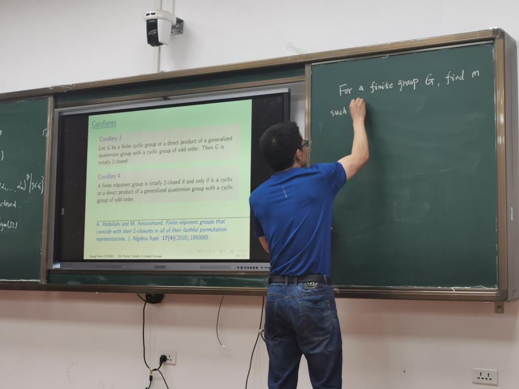 陈刚教授从定义、基础知识、研究动机等三个方面展开报告。首先陈刚教授利用置换群的完全嵌入性质证明了有限完全2-闭群的任何阿贝尔正规子群都是循环的,从而得到了有限幂零的完全2-闭群的刻画。其次,利用有限幂零群的2-闭包的性质证明了两个阶互素的有限完全2-闭幂零群的直积仍然是完全2-闭群。最后还得到了有限完全2-闭群的一些特征子群如中心、Fitting子群等也是完全2-闭群。同时利用所得到的这些有限完全2-闭群的群论性质,一些已知的结果的证明得到了简化。