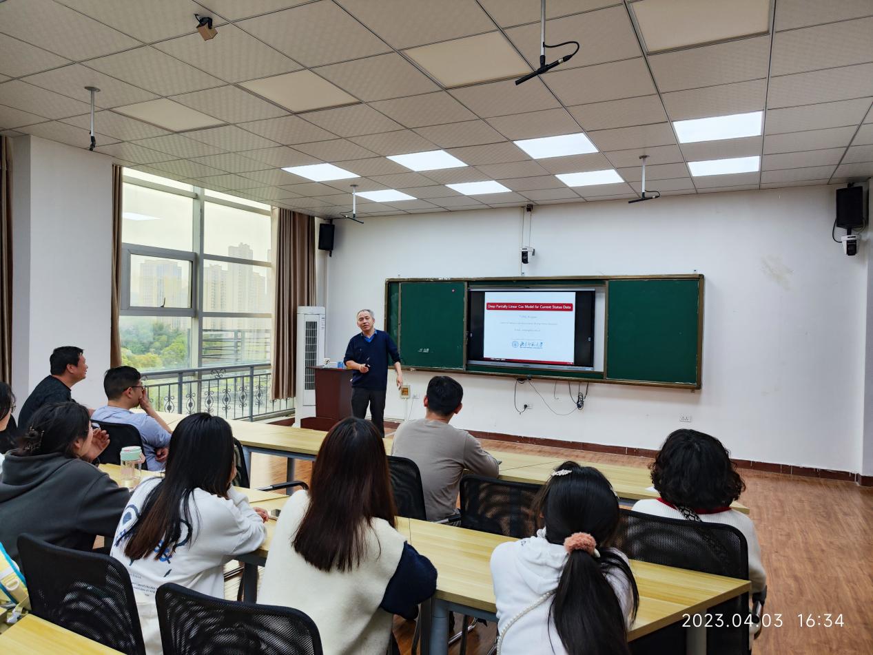 (通讯员:钟绍军)4月3日下午,我校楚天学者、北京师范大学统计学院数理统计系主任、博士生导师童行伟教授应数统学院邀请,在师范技能训练中心为数统学院统计学专业师生带来一场“Deep Partially Linear Cox Model for Current Status Data”为主题的学术讲座。本次讲座由数统学院院长陈生安主持,统计专业部分师生聆听报告。
