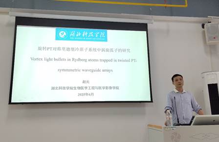 生物医工学院的赵元老师则聚焦于“旋转PT对称结构的里德堡冷原子系统中涡旋光弹的研究”。赵老师从里德堡冷原子系统的特性出发,深入探讨了旋转PT对称结构下涡旋光弹的产生机制和传播特性。该研究不仅在基础物理领域具有重要意义,还为量子信息、光学通信等领域的应用提供了潜在的理论支持。生物医工学院副院长余维教授主持了赵元老师的报告,在报告结束后,余院长组织师生与赵老师进行了深入交流,大家就研究中的关键问题、实验方法等展开了热烈讨论。