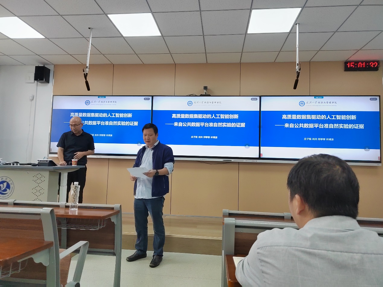 活动特别邀请了武汉大学二级教授、经济学博士庄子银教授,以及生物医学工程与医学影像学院的邢君老师作为主讲嘉宾。庄子银教授以其深厚的学术功底和丰富的实践经验,带来了题为《高质量数据集驱动的人工智能创新:来自公共数据准自然实验的证据》的精彩报告。