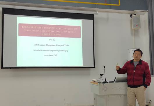 余维教授则围绕“基于引导图像滤波的自监督学习低剂量CT图像去噪方法”展开报告。针对低剂量计算机断层扫描(LDCT)图像因辐射剂量降低而产生的严重噪声问题,余教授提出了一种创新的自监督去噪方法。