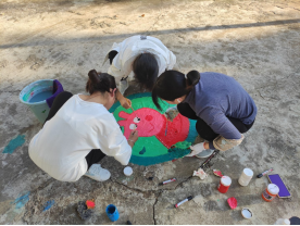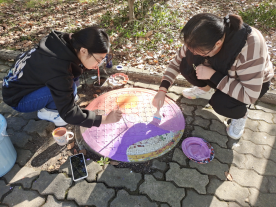 此次井盖涂鸦活动所使用的材料均是防雨环保材料,在绘画的过程中,以小组为单位,围坐在井盖旁,分工合作,你来勾勒,我来涂色,大家都用心为井盖装扮一番。当天天气晴好,午后的阳光也比不上画手们的热情,他们在太阳底下,专心地沉浸在自己的绘画世界里。画手们先将井盖用抹布清洗一遍,然后上一层底色,又用记号笔勾勒出大概的线条,最后涂上颜料。同学们将简单、时尚、正能量的元素融入到画面中,用艺术形式扮美了校园。看着自己的作品从无到有、慢慢成型,画手们都说很有成就感,更增添了自己对校园的无限热爱。