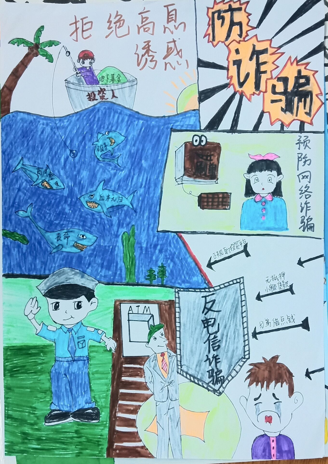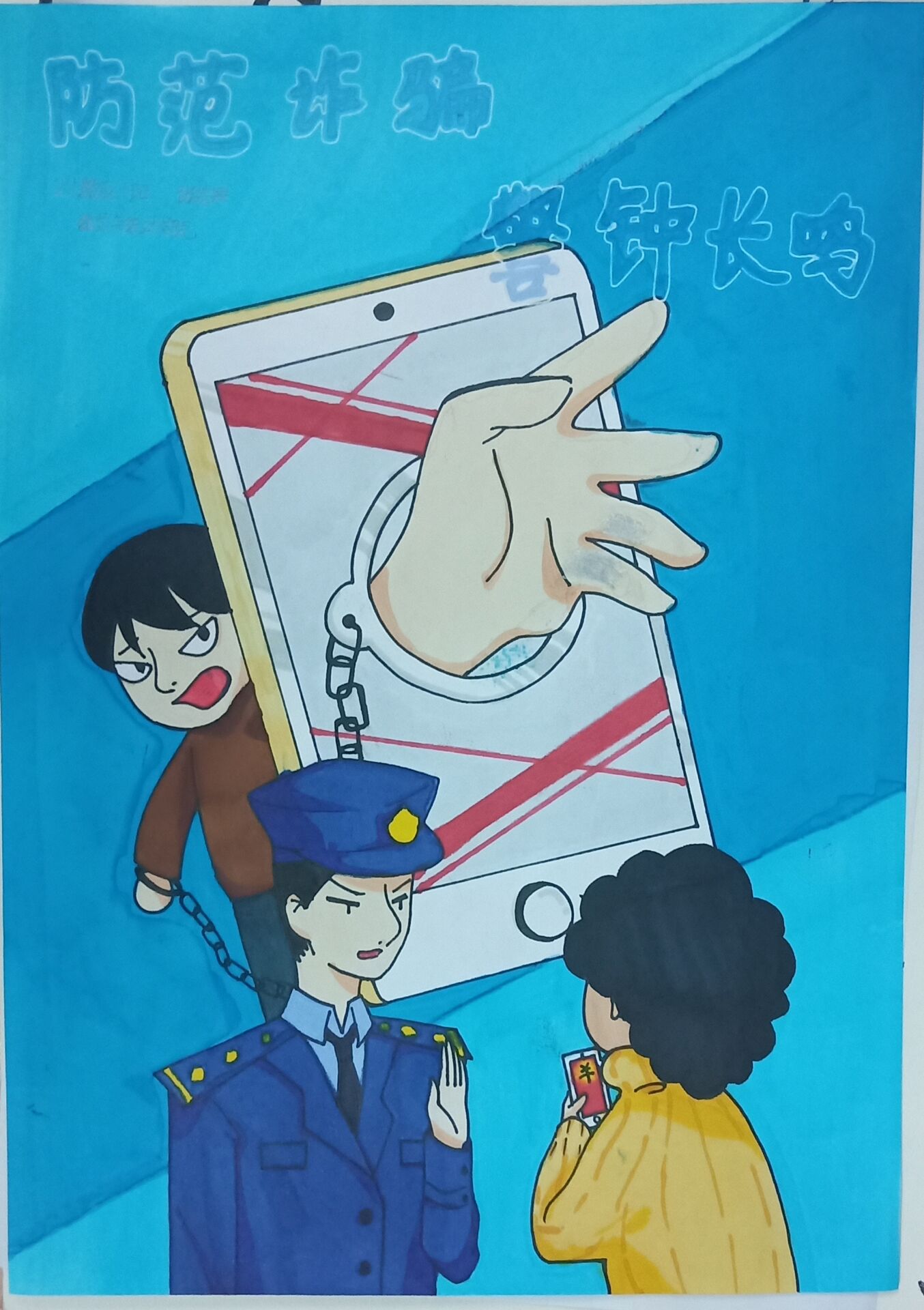 活动期间,同学们积极报名、踊跃投稿,充分发挥自己的奇思妙想,利用书法、绘画、短视频以及海报等多种方式全方位、多角度地展现出诈骗分子的犯罪手段,用卡通形象和案例再现生动的绘制出各种网络电信诈骗形式,寓教于乐、引人深思,充分体现了“防诈反骗”的设计主题与理念。