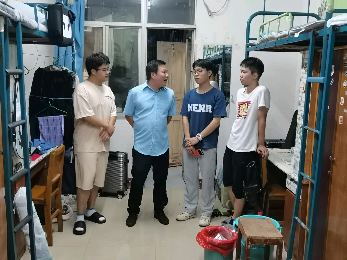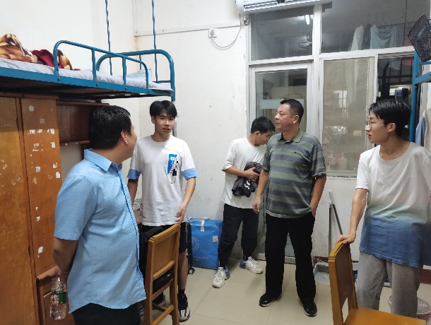 新学期,新作风,新姿态,迎新生。为了进一步了解2022级新生的宿舍生活情况并让同学们能尽快适应新环境。9月4日晚,太阳集团网站8722陈生安院长、卢曙中书记、辅导员曹键老师和余玲玲老师、22数应班主任饶继光老师、王歆老师,开展了宿舍走访工作,为新生答疑解惑,传递学院温暖。