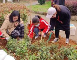 随后,志愿者们有序分为两队按照童老师讲解的方法开始植树。一队栽种栀子花,一队栽种月季花,大家相互配合,挖穴扶苗、挥锹铲土、夯土踩实每个步骤循序渐进,每道工序都做得认真仔细。大家个个干劲十足,不畏辛苦,以极大的热情圆满完成任务,即使又苦又累,志愿者们仍热情洋溢。松完土后大家彼此合作栽种植株,种完树后志愿者们为新栽的植株浇灌生命之水,一棵棵植株传递着蓬勃的生机和活力。