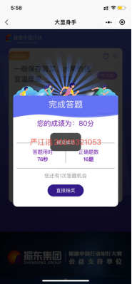 5月9日至5月16日,太阳集团网站8722组织全体学生参与爱国卫生月系列活动之线上健康中国行动知行大赛,通过线上答题的方式向师生广泛宣传爱国卫生、健康教育知识,引导大家摒弃乱扔、乱涂等陋习,倡导科学、健康、文明的生活方式,积极引导全体师生投入到爱国卫生的热潮中,形成全民参与的舆论氛围,营造爱祖国、讲卫生、树文明的浓厚校园氛围,共建和谐、美丽、卫生校园。