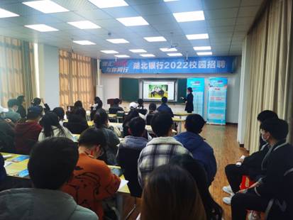 宣讲会中,湖北银行相关负责人围绕企业规模、企业文化、员工的福利与待遇、培养方向等多个方面进行介绍,并向我校参会学生展示了此次的招聘岗位、要求等相关事宜。据了解,本次湖北银行本年度校招预计招聘逾40人,包含总行管培生,总行科技人员,武汉城区工作人员,市州分支行工作人员多个工作岗位。