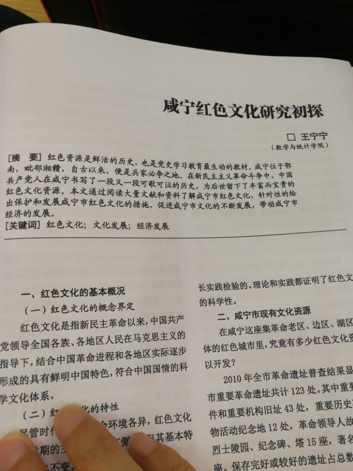 王宁宁的获奖作品——《咸宁红色文化研究》详细论述了红色文化的概念和特性,罗列了咸宁市现有文化资源,并概述了咸宁市文化资源开发现状,最后对开发咸宁市红色文化资源提出了政策建议。