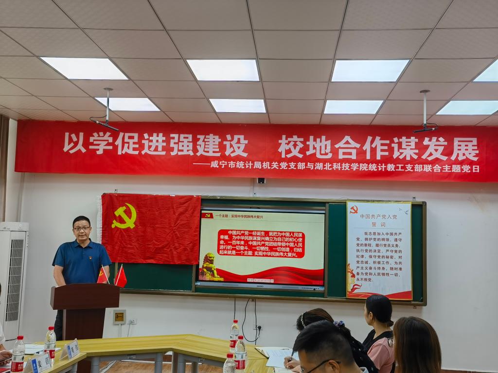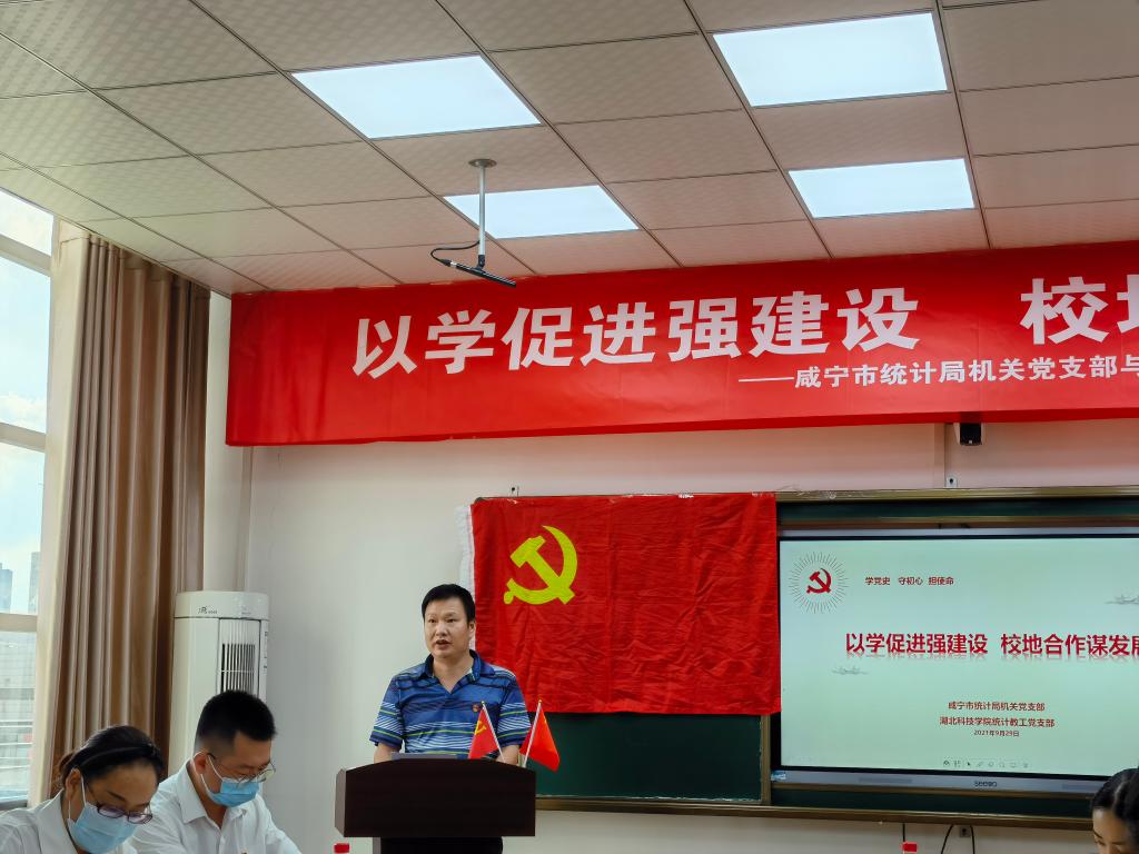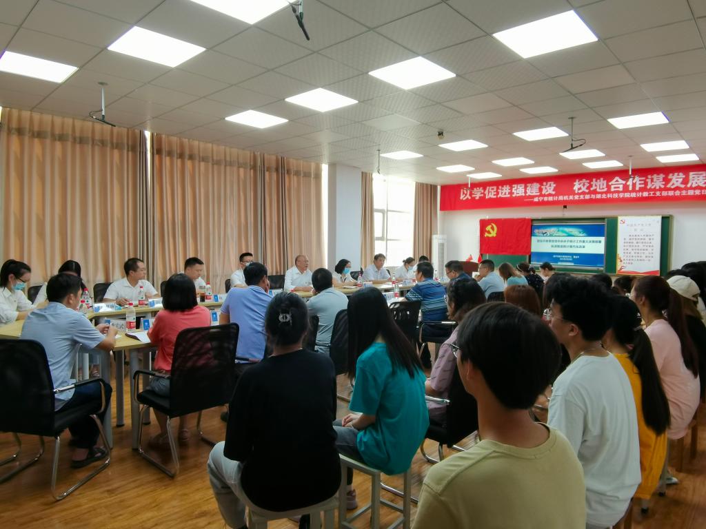 为深入学习贯彻落实习近平总书记关于党史学习教育的重要论述和指示批示精神,深入学习宣传贯彻习近平总书记“七一”重要讲话精神,持续推动党史学习教育走深走实走心。2021年9月29日下午,太阳网集团tcy8722统计教工支部联合咸宁市统计局机关党支部开展了第九期主题党日活动。咸宁市统计局党组成员、机关党支部委员、数统学院领导班子成员、统计教工支部全体党员出席活动,党外统计专业教师列席,统计学专业学生代表参加活动。