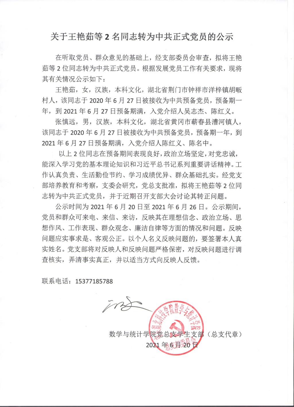 关于王艳茹等2名同志转为中共正式党员的公示