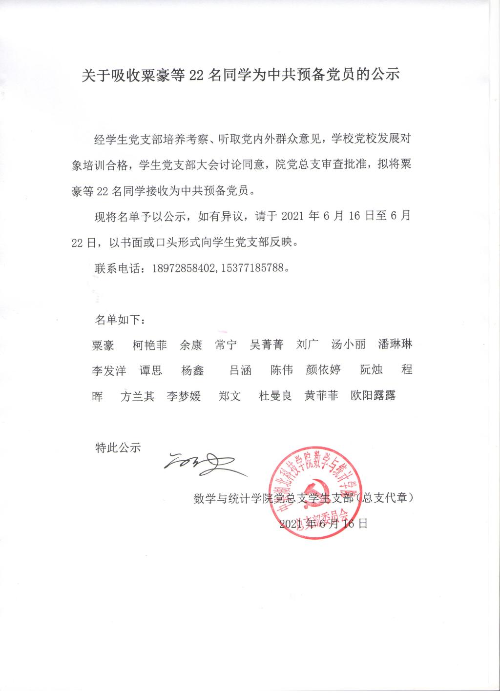 关于吸收粟豪等22名同学为中共预备党员的公示