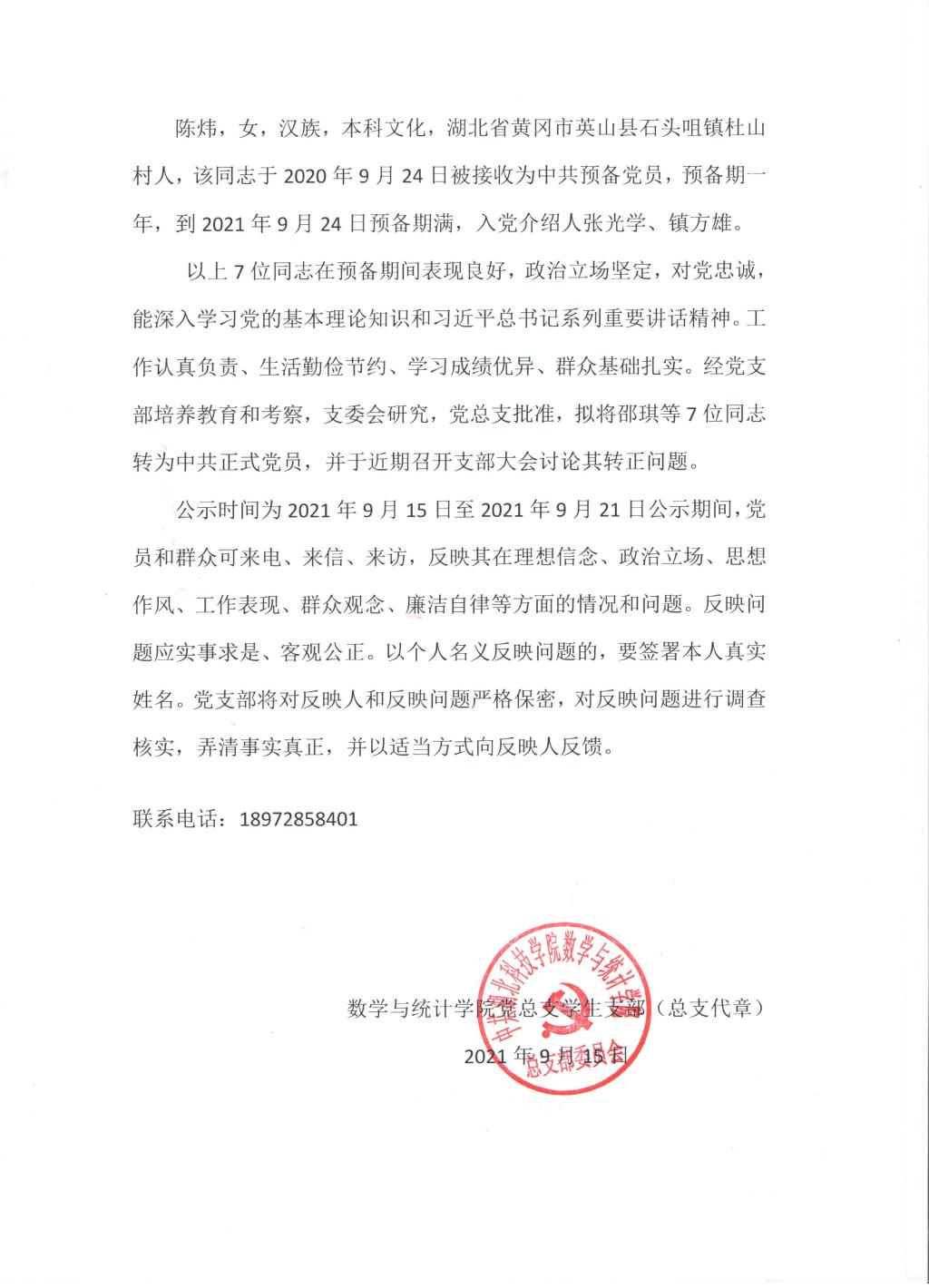 关于邵琪等7名同志转为中共正式党员的公示