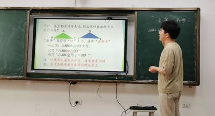 参加此次考核的李徐同学采用信息化PPT和传统教学结合的手段,划分了情景导入、探究新知、应用巩固、小结反思四个板块循序渐进地对《全等三角形》进行了教学讲解。全体评委老师们认真聆听,并对该同学认真的教学态度、自然完整的教学过程以及充分的教学准备给予了充分肯定,同时也提出板书不充实、难点不突出等不足之处。最后,评委为李徐打出考核分数,该同学顺利通过教师能力考核。