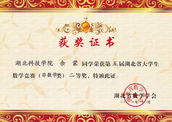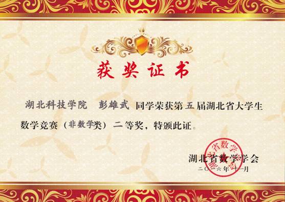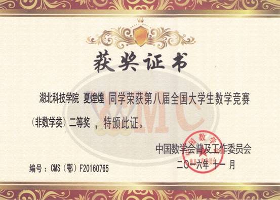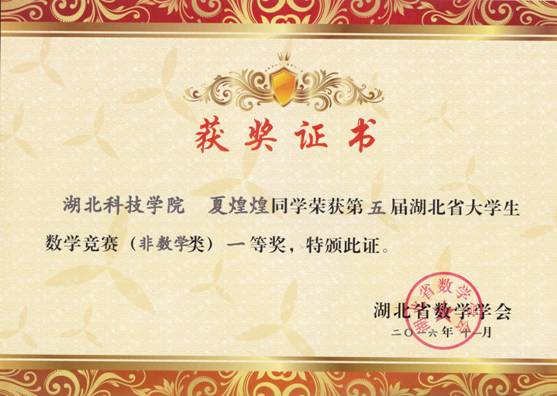 近日从湖北省数学会获悉,我院2016年选派的学生参加大学生数学竞赛再获佳绩,获得国家二等奖一项、国家三等奖八项、湖北省一等奖一项、湖北省二等奖二项、湖北省三等奖二项,这是我院自2011年参加该项赛事以来的最好成绩。